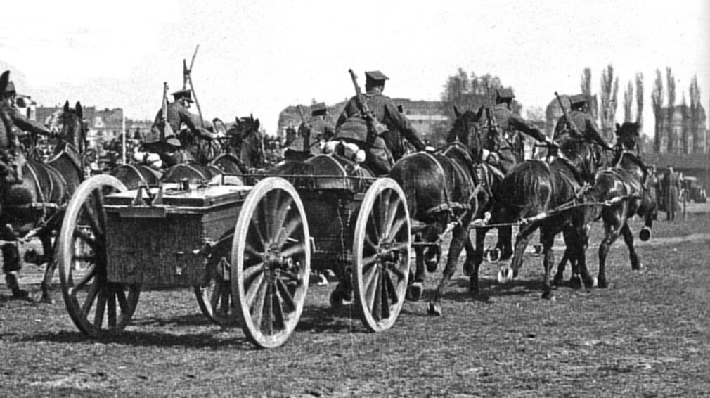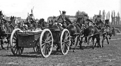 The gun was towed by a team of six horses, using a limber. Another six horses towed a caisson with a limber. Russian-origin limbers, used in infantry artillery, carried 36 rounds, and caissons – 44 rounds, in nine or eleven four-round drawers[note 1]. Ammunition was unitary. Fuzes were kept in two boxes added atop of the caisson. Italian limbers, used in horse artillery, carried 32 rounds, and caissons – 64 rounds, stored vertically (originally they came from Italian 75 mm wz. 06R guns, withdrawn earlier from Polish service). A number of Russian limbers were used in horse artillery as well (differing in lack of crew seats). Limbers and caissons of an ammunition supply column, of Russian origin, had 48 and 36 rounds respectively[1] (? - probable error, possibly these figures should be reversed).