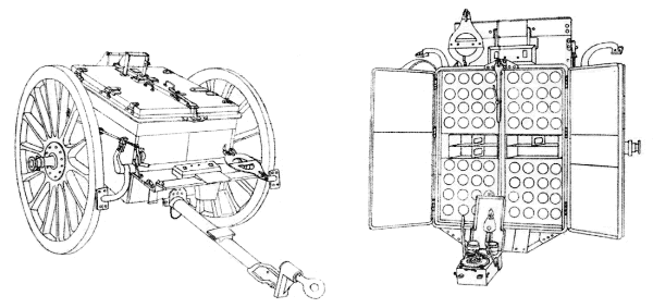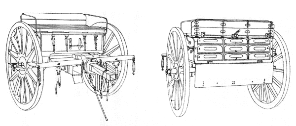 1. The issue of Russian-origin limbers and caissons, used by infantry artillery, is not entirely clear. They all used four-round drawers for ammunition. In Russian service, light artillery limbers M1900 carried 40 or 44 rounds in 10 or 11 drawers in four rows (gun limbers and caisson limbers respectively). Russian horse artillery limbers were lower and carried 28 rounds in 7 drawers in three rows, and had no seats for the crew. In each case, there was also central equipment drawer. A Russian caisson took 48 rounds in 12 drawers, without an equipment drawer.