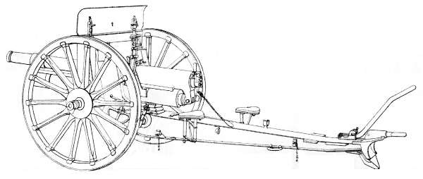 The cannons wz. 02 and wz. 02/26 had a box trail, with a fixed spade. The barrel was aligned with the trail, and had only limited traverse on an axletree. To change direction, the trail had to be lifted and turned by the crew, using a folding aiming handle above the spade. The barrel was attached to a hydraulic recoil mechanism with a spring recuperator. A distinguishing feature of both guns was a fixed shield with a large rectangular opening, attached to the axletree. Behind the opening there was a smaller movable shield, attached to the carriage and traversing with the barrel. There were also two folding shields above and under the fixed shield.