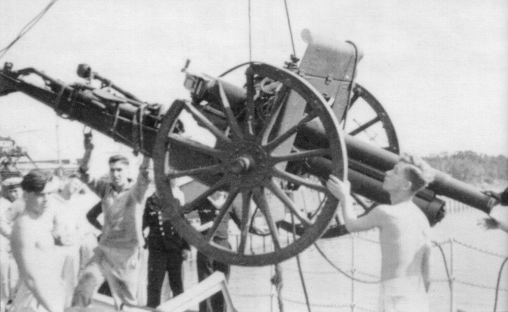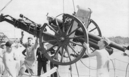 There was also created one three-gun platoon No. 111, but in summer of 1939 one of its 76.2 mm guns was clandestinely sent to Polish transit depot at Westerplatte in Gdańsk, defence of which became one of symbols of Polish campaign. It was the only field gun available at Westerplatte and on 1 September 1939 it fired 28 rounds across a harbour channel, destroying German MG emplacements in harbour warehouses, before it was damaged by a battleship Schleswig-Holstein. The platoon No. 111 itself, with two guns, was assigned to the 2nd Naval Rifle Regiment of the Land Coastal Defence, defending an area around Gdynia until 19 September 1939 (apart from these, it had own platoon of 75 mm wz. 97 guns, and both types operated together, what caused some trouble for a commanding officer, due to different methods of calculating fire orders).