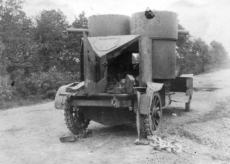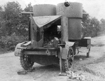 An unique photo of a destroyed Austin the 2nd series, possibly near Kolomyia, July 1917. A construction of a rear "annex" is visible, with a pair of doors and an observation hatch. Also "combat" wheels and an open box for wheels below a turret are visible. |