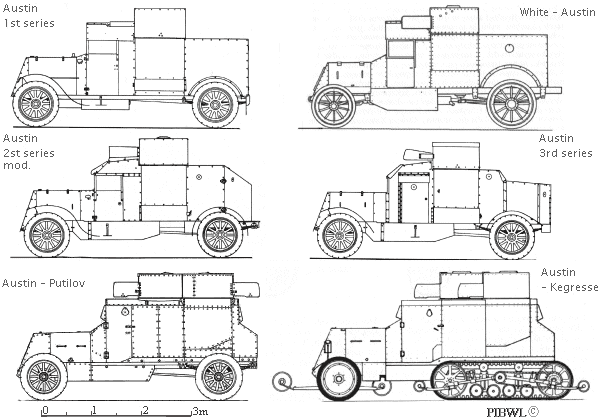 Austin I series | Austin II, III series | Austin-Putilov | Austin-Kegresse | White (Austin I series hull) | |