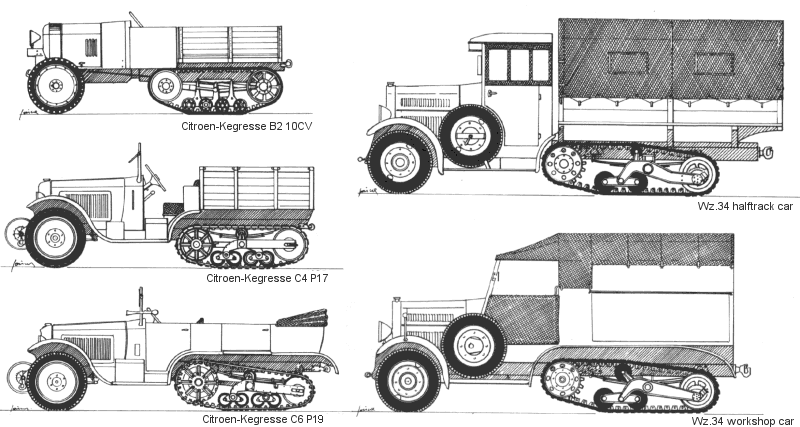 In armoured units a small number of original halftrack staff cars Citroën-Kegresse B2 were used in the twenties and early thirties. The cars with truck bodies were also used that way. In the late thirties these cars were replaced with Polish standard trucks and "£azik" field cars (PF-508/III and PF-518). There is no information about their possible further usage, however most of these cars should survive until 1939.