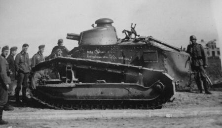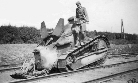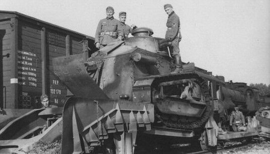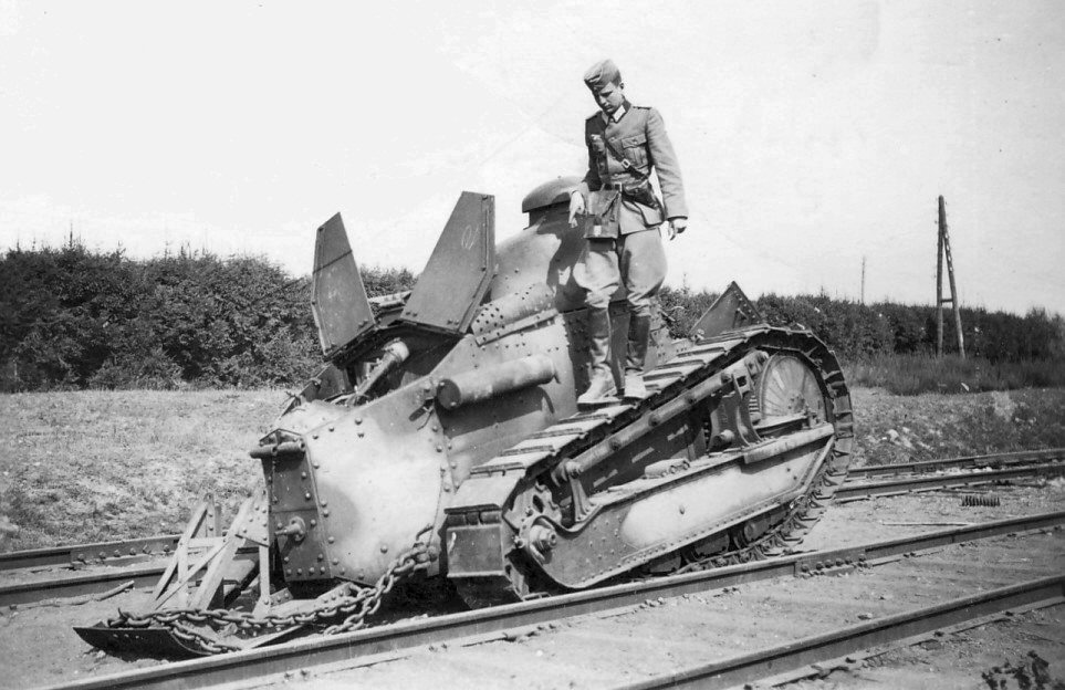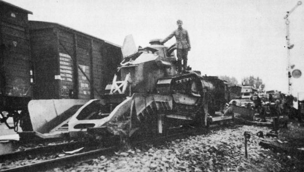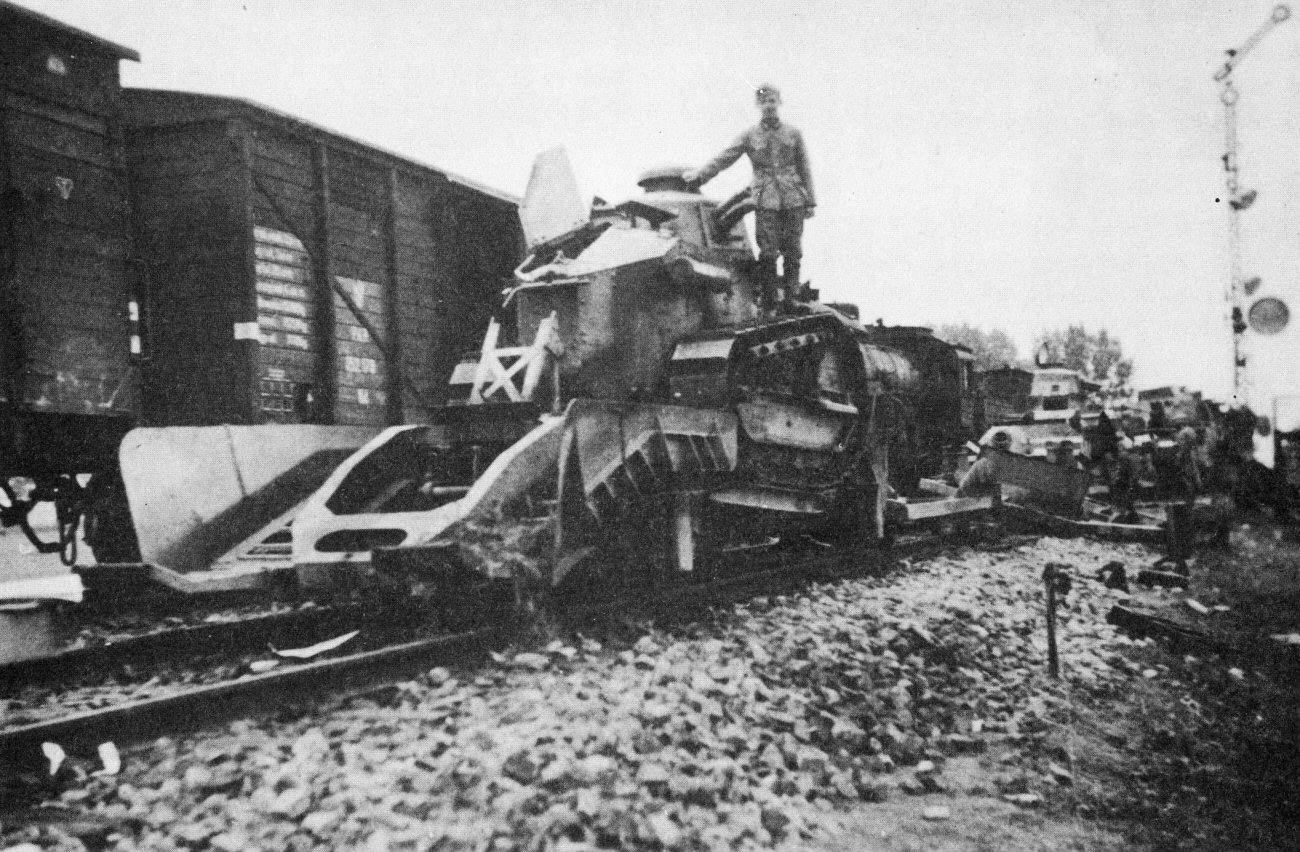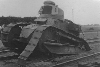 Left photo depicts Renault FT tank, abandoned on a ground. Photos of this tank were described by the Germans as taken in Łowicz area, so if it was correct, it must have belonged to one of the two trains mentioned above. It is confirmed also by a shelf on a side, probably with a battery, typical for FT tanks modified with an addition of electric installation. An inscription is German. Upon an engine compartment there lies a tripod of Hotchkiss HMG. |