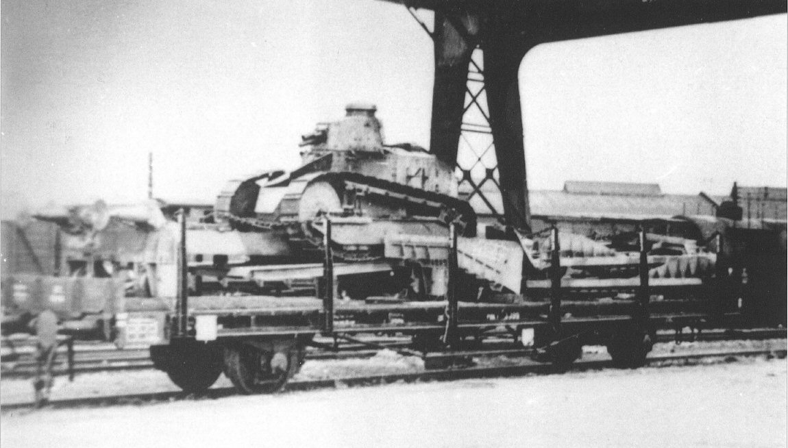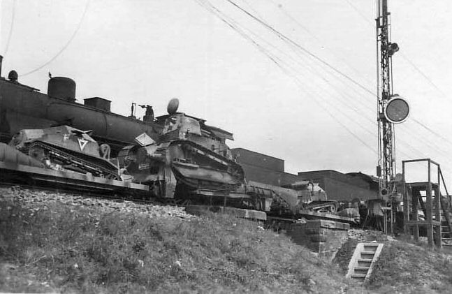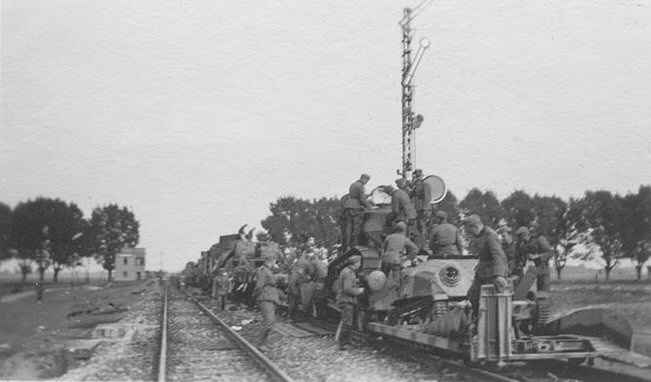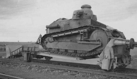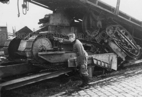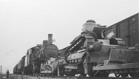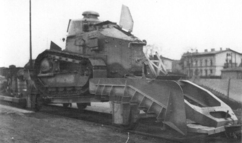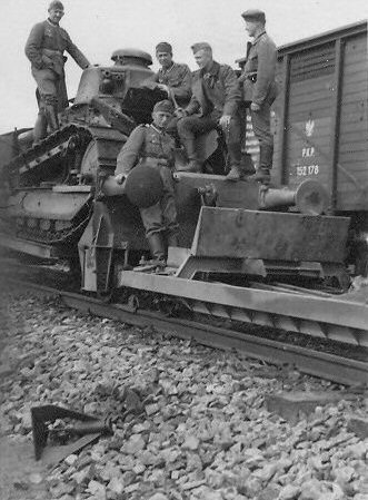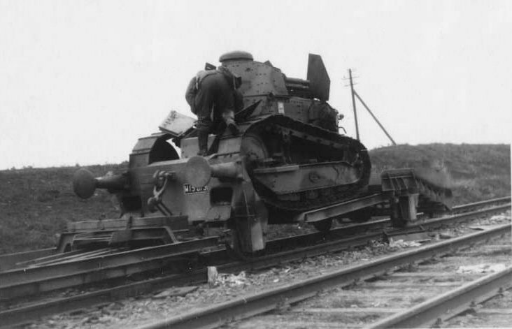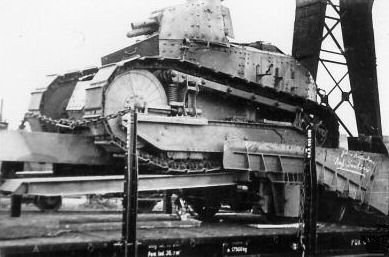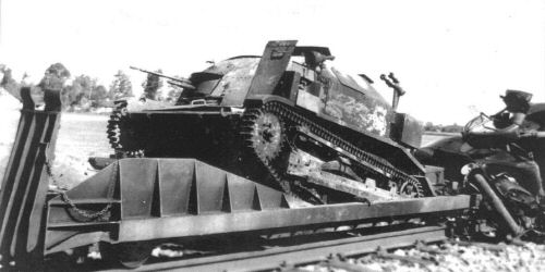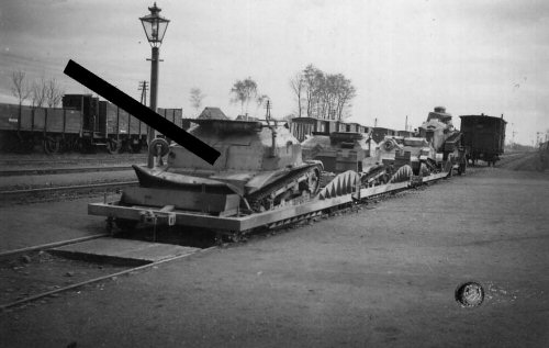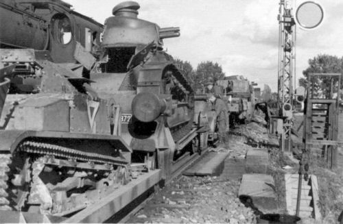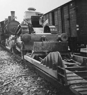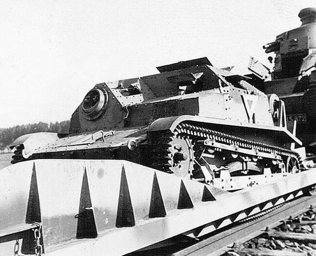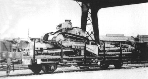 A draisine R loaded upon a flatcar by the Germans, along with two tankette runners. The tank has not embarked the chassis completely, showing a supporting beam. The tank has electric lightning. |