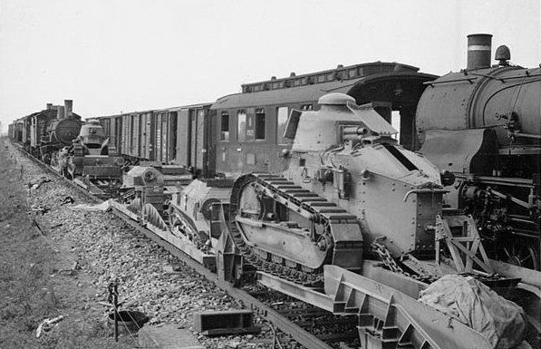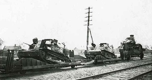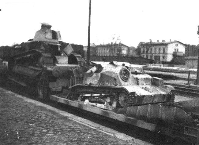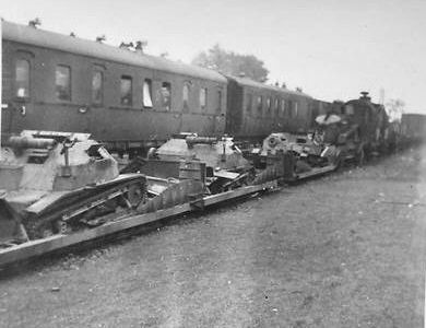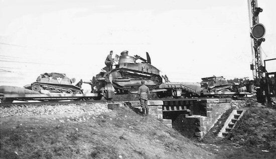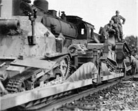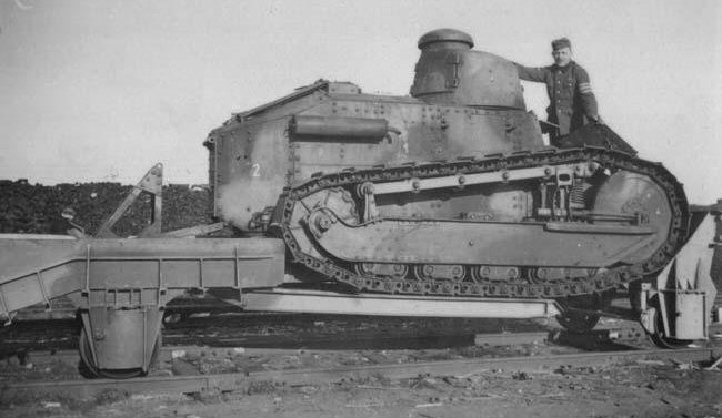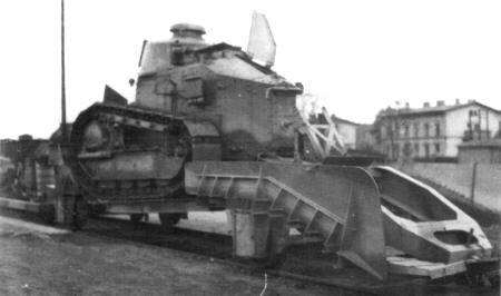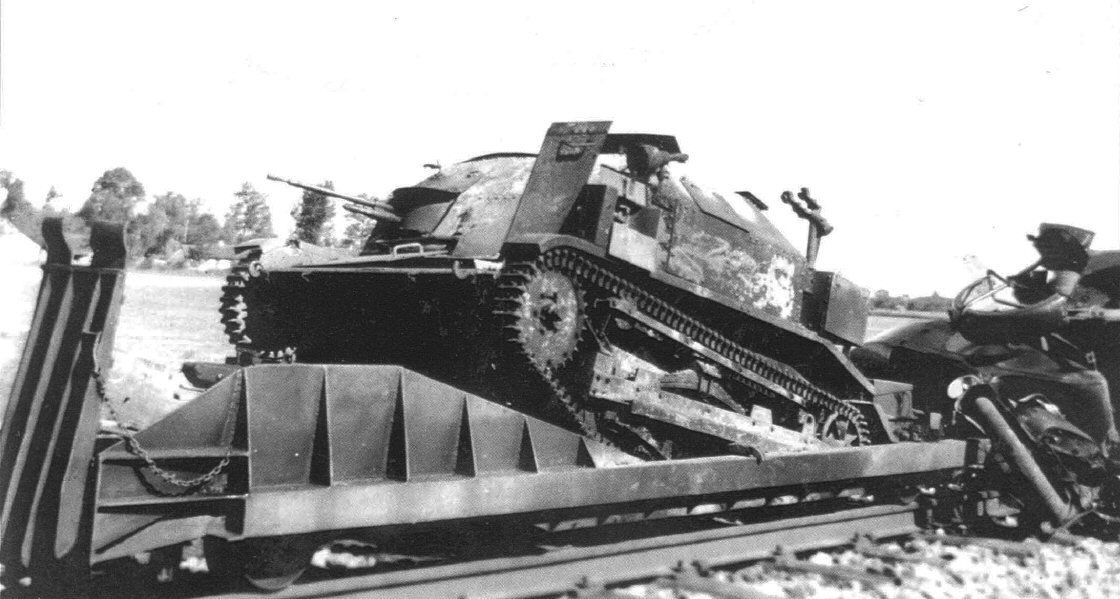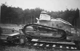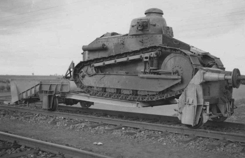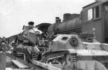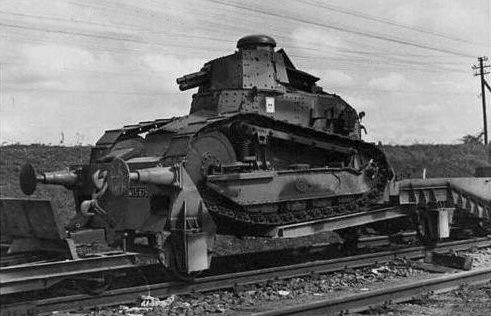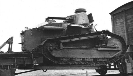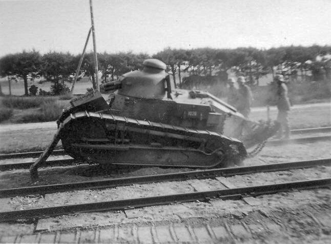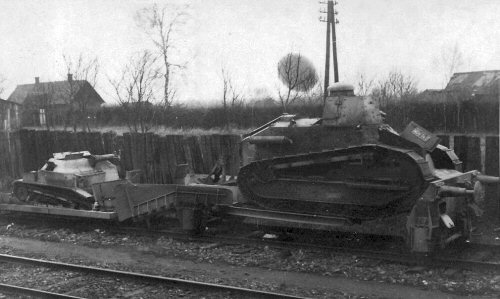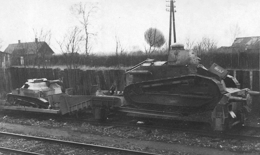 A draisine R loaded upon a flatcar by the Germans, along with two tankette runners. The tank has not embarked the chassis completely, showing a supporting beam. The tank has electric lightning. |