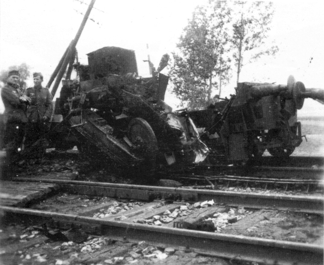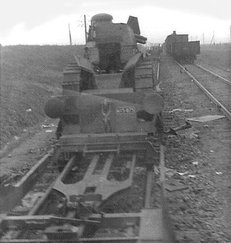 A photo on the right shows remains of R draisine of Nr.14 armoured train, which was blown up by the crew in the same area. We had expressed doubts as for its identification, but lately there have been published photos of this draisine coupled to Nr.14 train (buffers to the right belong to its flatcar). There are no reports about this train's destruction, and a fate of its other draisines is not known (the second R draisine was not present with the destroyed train). |