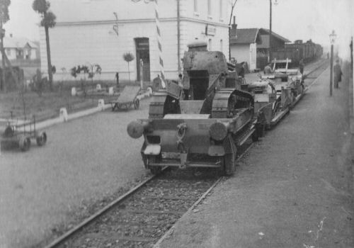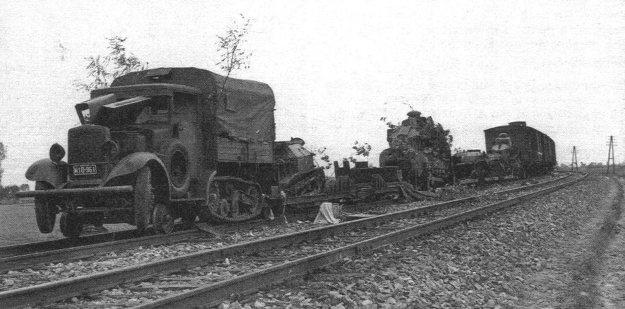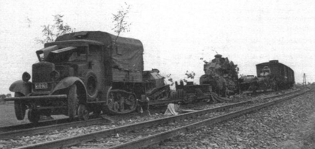 | Partially obscured, nevertheless interesting photo of Nr.54 train's draisines - this time without a tanker. Note a way of mounting a spare wheel, different than in Nr.12 train's tankettes. Along with moving an AAMG mast to a rear slanted plate, it indicated tankettes fitted for radio. |