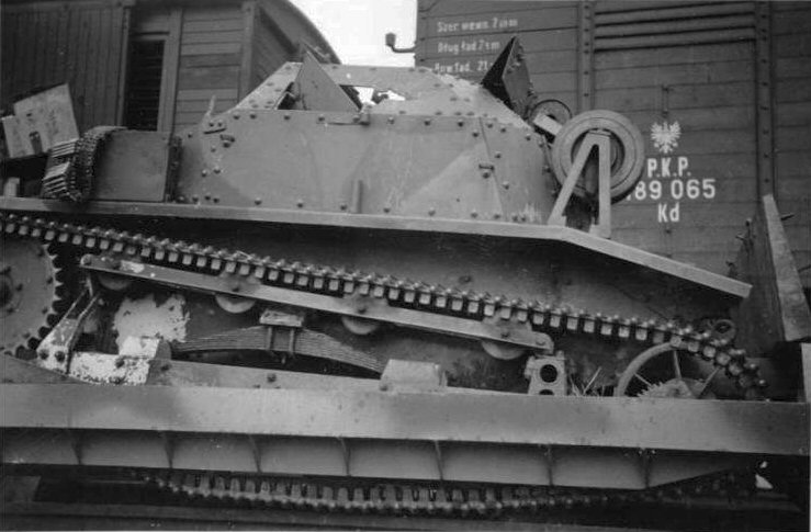 | A close-up of a draisine TK (4) in original location. Paint condition suggests, that it was burnt. A rarely visible searchlight is mounted on a left side (it was usually carried inside). Visible is a fragment of a supporting beam below the tankette, lifted high. A machine gun 7.92 mm Hotchkiss wz.25 has not been removed by the crew. |