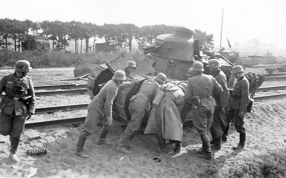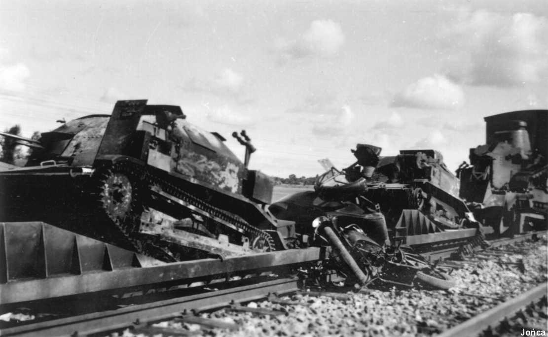 Draisines R (left: 1, right: 2) and TKS (4) from the train Nr. 12 taken by the Germans to some depot station (probably Ożarów Mazowiecki or Błonie). |