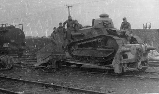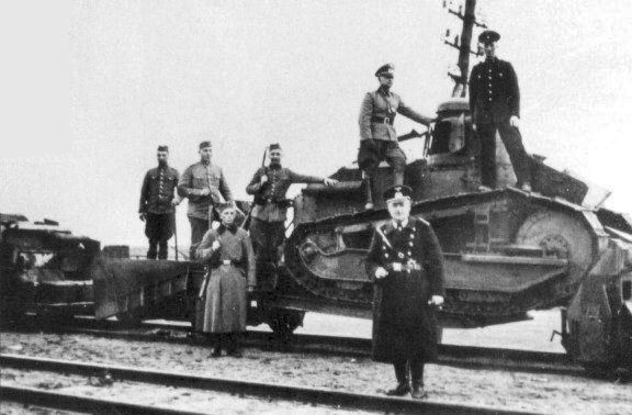 Zdjęcie po lewej przedstawia czołg Renault FT porzucony "na lądzie". Zdjęcia tego czołgu opisywane są przez Niemców jako pochodzące z rejonu Łowicza lub Zdunów, stąd musiał on pochodzić z jednego z dwóch wymienionych wyżej pociągów. Na jego pochodzenie z pociągu pancernego wskazuje też półka z tyłu z (prawdopodobnie) akumulatorem. Napis na burcie jest niemiecki. Na czołgu leży podstawa do ciężkiego karabinu maszynowego Hotchkiss. |