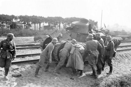| Z lewej: zdjęcie, jak powyżej, lecz z widoczną z lewej strony zrzuconą z szyn prowadnicą tankietki TKS (3).