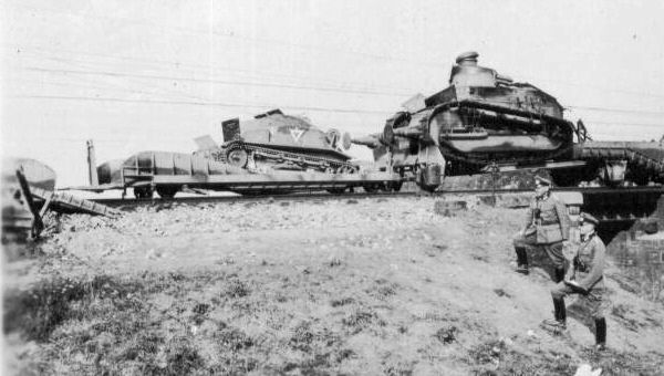 | Ciekawe ujęcie od prawej strony, na którym widoczna jest druga drezyna R, dalej drezyna TKS (4) zwrócona w lewo i obie wcześniejsze tankietki TKS zwrócone w prawo (2 i 3), brakujące na większości zdjęć. W tle drezyna R (1). Przyczyna usunięcia ze składu tankietek nr 2, a następnie nr 3, nie jest znana; nie widać ich też w okolicy pociągu. Czołg FT wyposażony jest w oświetlenie.