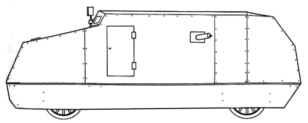 The "Piłsudski's tank" weighted some 5 tons, its length is estimated at some 620 cm, and height some 220 cm[1]. It was armed with four casemate-mounted machine guns in embrasures in all sides, almost certainly Austrian 8 mm Schwarzlose M.7/12. A crew was 7-8 (during action of November 9 there were reported: a commander, a driver, two assistant drivers and four gunners). A reported fault was a lack of ventilation during machine gun fire.