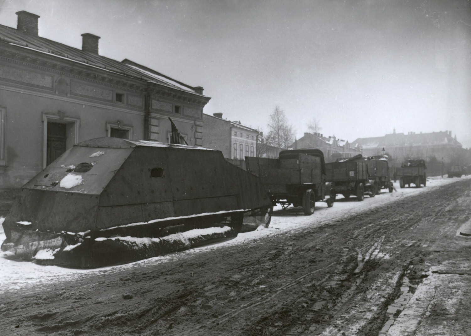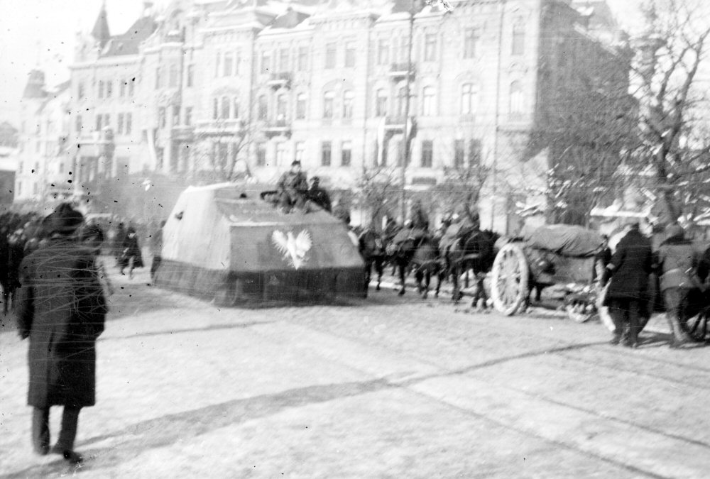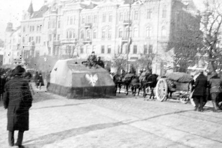 An idea of building an improvised armoured car was put forward by Antoni Markowski, a painter and drawing professor at the 2nd Real School in Lviv, and presented to a commandant of the 2nd Polish Army Group in Lviv, Cpt. Mieczysław Boruta-Spiechowicz. It was quickly accepted and on November 3 its construction began in Lviv railway workshops at the main railway station (according to some reports already on November 2). An unidentified truck, not named in existing documents, was taken as a basis (possibly a 5-ton Praga V)[3]. Armour layout and thickness was also designed by Antoni Markowski. It was named in a honor of the former commandant of the Polish Legions, General Józef Piłsudski, imprisoned by Germans in Magdeburg at that time, with whom hopes for the revival of the Polish state were linked. The car is usually known in literature and accounts as "Józef Piłsudski", however some accounts name it "Piłsudczyk" (Piłudski's man); some sources also call it "Tank Piłsudskiego" (Piłusudski's tank). M. Kuchciak first noted, that there might be a single word name painted on an upper frontal armour, corresponding with the "Piłsudczyk" name – which was a common practice at that time[5]. The work was completed by 7 November. A test drive revealed some faults, which were corrected by the next day. It was probably the second armoured car built in reborn Poland, after little-known "Chwat" from nearby Przemyśl, which was used for patrolling already on 7 November.