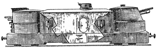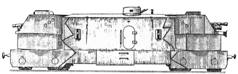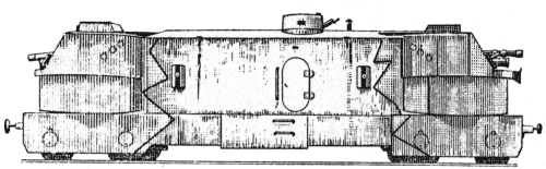 Other armament consisted of nine 7.92mm wz. 08 (Maxim) heavy machine guns: four in forward ports in artillery turrets, on either side of guns, four in cylindrical mountings in wagon's sides, and an AAMG. Presumably the original machine guns were Russian 7.62mm Maxim M.05 or M.10. This wagon was later used in the German Panzerzug 22. Apparently in the German service this wagon was fitted with small hatches in turrets' barbettes, in the wagon's longitudinal axis, enabling passing between wagons. |