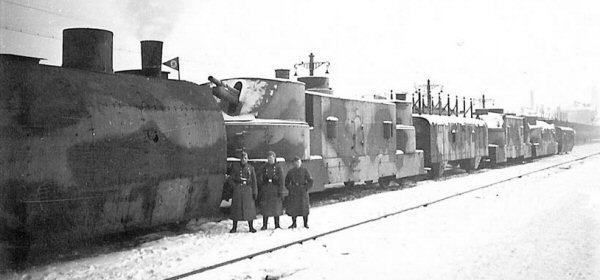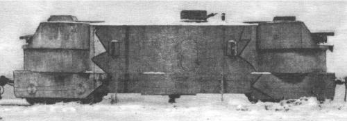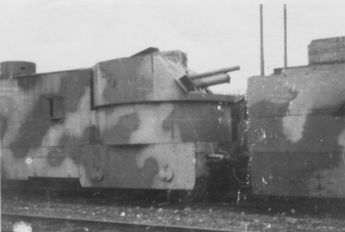 The final compostion of the "Groźny" was of two modern Soviet twin-turret artillery wagons of the same type. The first such twin-turret wagon, armed with two 76.2 mm guns, was assigned in March 1920. It was captured from a Soviet train BP no. 56 "Kommunar" near Olevsk W, on 17 March 1920 note 1. In March-October 1920, the "Groźny" consisted of one twin-turret wagon and a Soviet single-turret improvised wagon, constructed in railway workshops in Zdolbunov from a steel open four-axle coal wagon, with reinforced walls, a 76.2 mm artillery turret fitted in forward end and a protected casemate above the rest of the wagon. Its origin is not entirely clear; according to newest source it came from BP no. 104 "Imeni Karla Liebknechta", captured on 12 August 1919 note 2. Both wagons were also fitted with machine guns, and the train also had some other improvised MG wagon(s). Initially the train presumably had a Soviet broad-gauge series O locomotive (no details are known). From September 1920 it used a standard-gauge series 73 locomotive, fitted with a full armour in Poland.