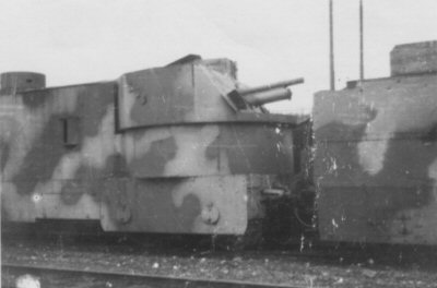 A good view of a "Krasnoye Sormovo" type artillery turret of former "Groźny's" wagon in the Panzerzug 22 en face. Oval ports for machine guns are visible on both sides of the 75mm wz. 02/26 gun. Note, that upper side corners were cut off, to better fit Western European loading gauge. A searchlight might be a German modification. [3] |