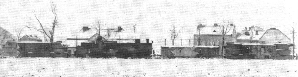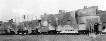 ![]() | An abandoned train nr.54 at Biadoliny station (from right: wagon with cannons, locomotive, assault wagon, wagon with a howitzer). |