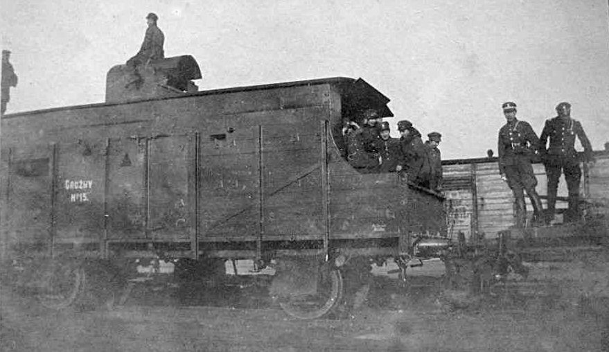 The original "Groźny" was built in January 1919 in Warsaw railway workshops, as the armoured train nr. 15 (P.P. 15 - Pociąg Pancerny nr 15). Initially, it consisted of improvised partially protected wooden freight wagons (two wagons protected with concrete in Nowy Sącz workshops, and a number of wagons protected with sand sandwich walls[11]). There is no detailed information on its composition. It participated in early part of the Polish-Soviet war in 1919, operating east of Kovel W. Because of a destroyed bridge on the Stochid before Kivertsi W, it did not go farther east and was used for patrolling of a captured area. Since the front moved east, and the train was of a little combat value, it was disbanded in September 1919 (its number 15 was next given to the "Paderewski"). Its name was however inherited by its stronger offspring, initially known as the "Groźny-szeroki".