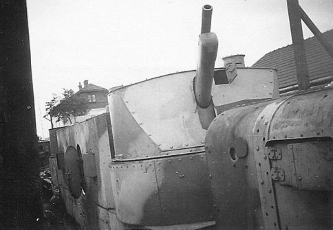 The assault wagon of "Groźny" in the German Panzerzug 21. Polish cylindrical MG mountings are replaced with simple fire ports. Note significant rounded roof sides. [3] |