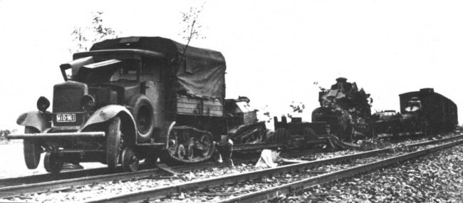 The auxiliary train also had two wz.34 half-tracked trucks, one truck (Polski FIAT 621?) and four motorcycles with sidecars CWS M-111 - carried upon three flatcars. Wz.34 half-tracks were in the repair patrol, and they could be equipped with a rail-riding device.