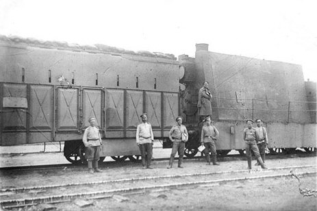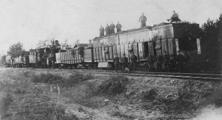 The creation of armoured trains in the frontline area of Poland, which had been annexed by Russia, began a few months after the outbreak of the war, probably on the initiative of the command of the North-Western Front, in order to secure railway transport. Most probably the first of them was a standard-gauge train built on the basis of two-axle open coal wagons of the Warsaw-Vienna Railway, which in older sources was referred to as the train of the 5th Siberian Railway Battalion and erroneously believed to have been formed in Riga in 1915[note 1]. Now it is known, that it was also the first Russian armoured train of the Great War.