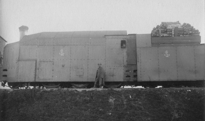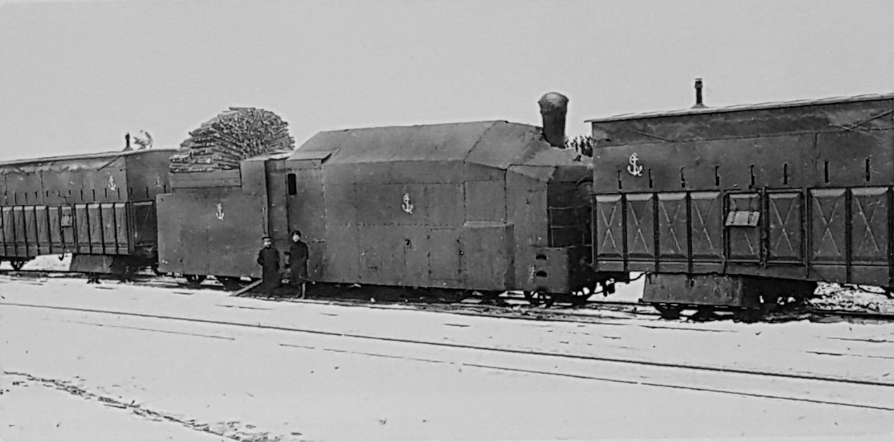 On 12 July 1915, the train of the Naval Special Duty Regiment was ready, and a week later it went into action to defend Ivangorod Fortress, covering withdrawing Russian units. The commander was Lieutenant Mukhin. On 19 July (1 August) alone, the train undertook six raids from the fortress in directions of Radom and Kozienice, fighting at Austrian infantry and cavalry. Thirteen crew members were awarded with St. George Crosses for this action. However, Russian troops were forced to withdraw from Ivangorod on 22 July, and the Naval Regiment was directed to the front. The train was then withdrawn to Brest, where on 8 August it was taken over by the 4th company of the 3rd Railway Battalion and refitted[4]. Probably at that time its locomotive was changed to Ya (Я) class no. 73 (of Polesia Railway, built in 1900, axle arrangament 1-3-0). It had a characteristic full streamlined armour, high above the boiler and a dome, distinguishing it from all Russian trains (older publications claimed erroneously, that only the armour of original locomotive was changed). Kolomiets wrote in an older source only, that already on 16 August, during the retreat from Brest, the train fought against the Germans near Kobryn, supporting Pereyaslav Infantry Regiment[4]. The train next returned to the Naval Special Duty Regiment. Around that time at the latest, characteristic marine emblems in a form of painted anchors appeared on wagons and the locomotive. Their colour was probably pale blue[1] (according to Kolomiets, white, but this seems less likely, because they contrast too weakly on some of the photographs). From mid-November to the beginning of the following year the train operated in Latvia, from Nicgale Station, subordinated to the 5th Cavalry Division[4]. In 1916 the train received number 4 in the Western Front (also known as number 4M, from Morskiy – Marine).
