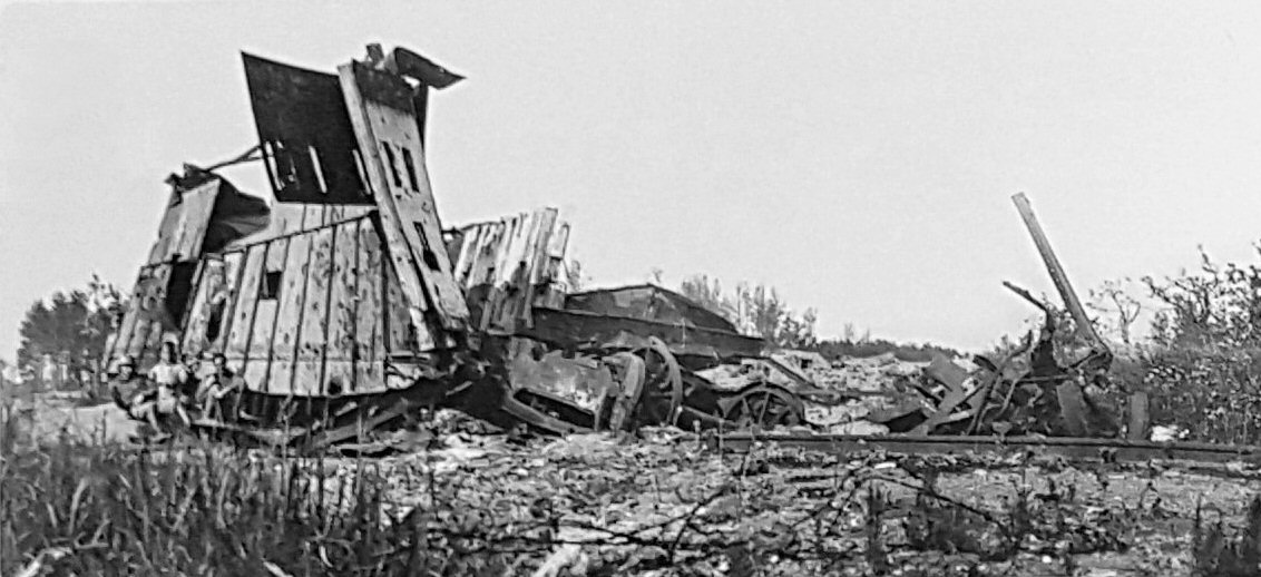 The "Revolutionary train" from the front, shortly after capturing by the Poles in October 1919, showing its Fox-Arbel wagon without Polish names yet. Two propaganda paintings on the superstructure are hardly visible – the front one overpainted the anchor, and the rear one partially covered it. A dome of the locomotive seems to be removed or shot off and lying aside. |