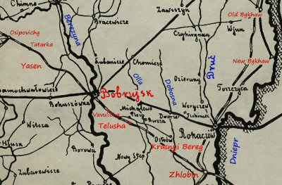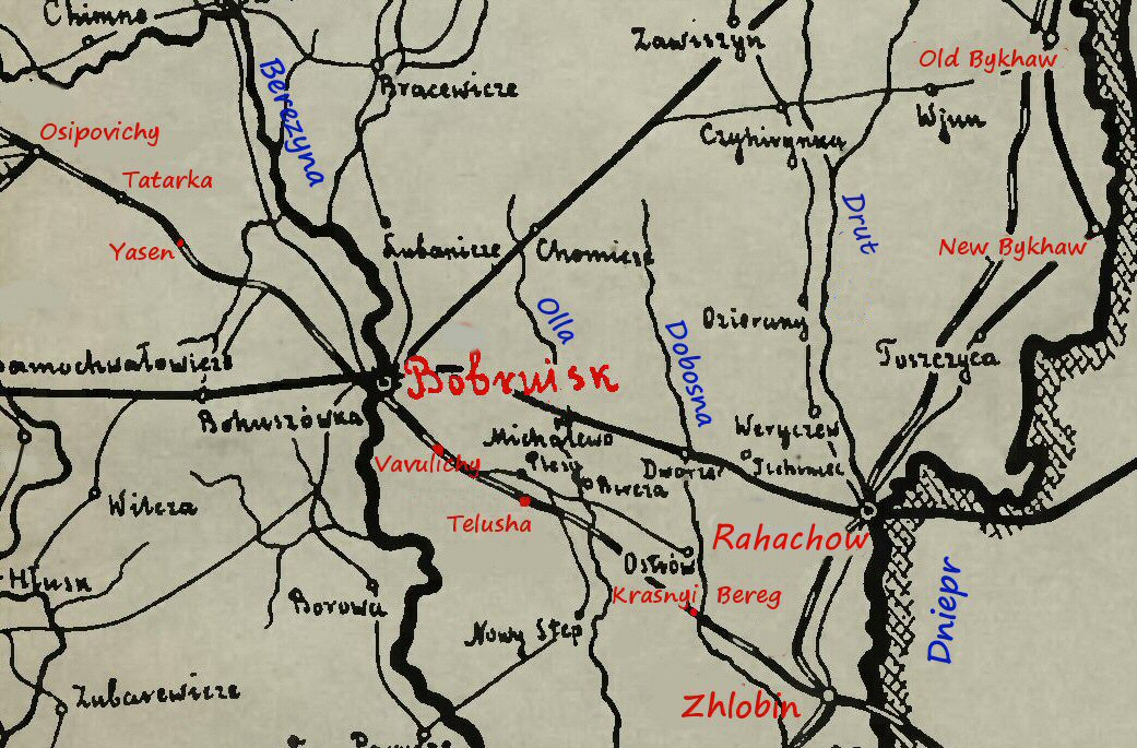 5. The train was captured, according to Polish descriptions, between stations Vavulichy and Rynia - current villages of Dubovka (in Belarussian: Dubauka) and Kovale (Kavali). The station next to the village of Dubovka is now called Savichy (from the village located on the opposite side of the tracks), while the station Rynia (now Telusha, in Belarussian: Tsalusha) is in fact located in the village of Kovale (Kavali), not in the village of Rynia located about 8 km north of the tracks, nor in the village of Telusha (Tsalusha) located on the railway line between Dubovka and Kovale (3 km from Dubovka and 8 km from Kovale). The village of Plessy is located between Kovale and Telusha. The old Vavulichy in the Bobruisk region should not be confused with the village of this name in Drahichyn region. (A map of the region)