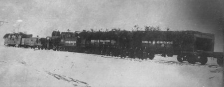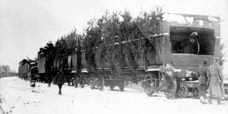 In June 1917, at the request of the Western Front command, the supreme command (Stavka) transferred the train from the Naval Brigade to the 10th Railway Battalion (in short: 10-й желбат, 10th zhelbat). At that time it consisted of Ya class No. 73 armoured locomotive, two armoured wagons marked as A and B (of Yekaterina Railroad), and a logistics section with an ordinary Shch class No. 3146 locomotive (from Vistula River Railroad), 12 box wagons of different purpose (including three for the crew, two ambulatories, a kitchen and magazines), a 2nd class coach for officers, a rack wagon for wood and a flatcar to carry draisines[9]. The armament was two 37 mm cannons with 350 rounds in total, eight Maxim machine guns and 100 Mosin rifles. In spite of this, the "armoured train of the 10th Railway Battalion" remained unused until autumn 1917 due to a lack of qualified artillerymen and machine gunners in the battalion.