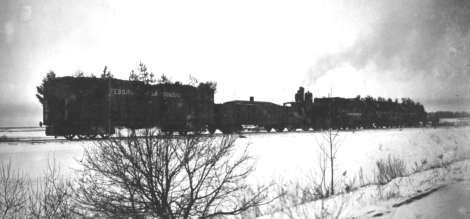 After the Bolshevik October Revolution, the crew, agitated on 29 October by podpraporshchik (Sergeant Major) Vasiliy Prolygin, arrested officers, and joined the Bolshevik side. Then the train, led by Prolygin, who was an engine driver, arrived at Minsk at night of 2 (15) November 1917, and its presence played an important role in an establishment of Bolshevik power in the city against other revolutionary factions. According to Soviet literature, the crew had already named the train after Lenin and painted his name in chalk on wagons by that time[7]. Nevertheless, photographs from 1918 indicate only, that the train carried a simple name: "Revolutionary train" (in an old spelling: Революціонный поѣзд, Revolutsyonnyi poezd), neatly painted on at least one wagon. Strangely, such name is never met in Russian literature in its context. Probably the inscription: "In the name of Comrade Lenin" (Imeni Tov. Lenina) was placed on the steam locomotive, which later carried such inscription it the train no. 6. The train participated, among others, in arresting of the Front staff in Mogilov. In January 1918 the train received an additional armoured wagon, originally armed with two 76.2 mm anti-aircraft M.1914 Lender guns, taken over from the 3rd independent railway anti-aircraft battery. Such wagons were a typical design built at Putilov Fatory in Petrograd (St. Petersburg), also on a four-axle Fox-Arbel wagon chassis, with a central low armoured casemate and two open emplacements at ends. It is not clear, however, if the wagon had functional armament, because subsequent photographs show it without cannons. Russian publications also generally mention, that 37 mm guns in original wagons' end walls were replaced with 76.2 mm field guns M.1902, but photographs prove, that this happened only after fighting near Zhlobin in February – March 1918.