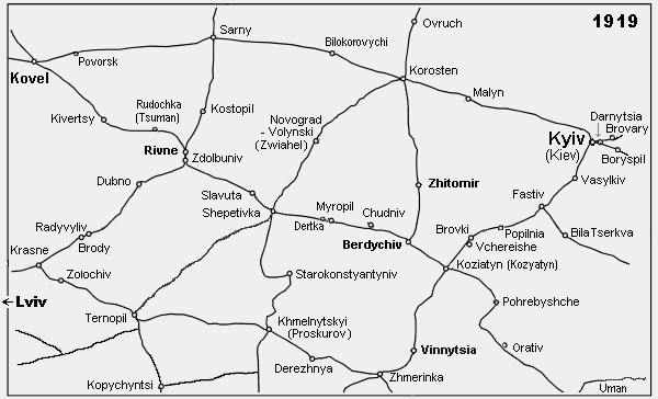 The "Strzelec Kresowy" reached as far as Orativ again on 5 June, but the situation on the front forced a withdrawal. The train avoided being cut off thanks to a quick provisional establishment of a blown-up bridge on the Rostavitsa before Koziatyn on 10 June by the 5th Railway Company. In following days it was assigned to the Koziatyn Defense and fought in Berdychiv area. Then it covered an evacuation of Koziatyn (14 June) and Vinnytsia (16 June), destroying the infrastructure left behind. It next came under the command of the 6th Army. From Zhmerynka it moved to Derazhnia on 19 June, helping to suppress a peasant diversion in villages between Zhmerynka and Serbinivtsi on the way. It remained in that area for several days, and on 23 June it forced the train "Bela Kun" to withdraw in an action off Radivtsy village (according to information obtained, the Soviet train got damaged).
