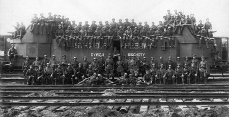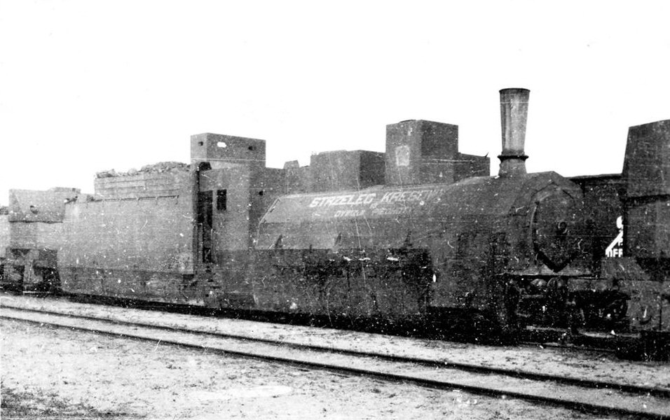In 1920 the train "Imeni Shaumiana i Dzhaparidze" was used in the war with Poland. During Polish Kiev offensive, on 27 April 1920, the train was detected at Holendry station near the village of Kotiuzhyntsi on the Koziatyn – Zhmerynka line. Polish patrols cut tracks on both ends, and after several hours of fighting and shelling by the 1st Battery of the 13th Kresy Field Artillery Regiment, the train was captured by soldiers of the 2nd Company of the 50th Kresy Rifle Infantry Regiment under the command of 2nd Lt. Julian Dotzauer (Kresy was a name of Polish Eastern Borderlands). Among other things, the banner of the Soviet 44th Rifle Division was found in the train. The train was initially manned by the 15th Sapper Battalion. Its locomotive and one wagon, the turret of which had been damaged by an artillery shell, were repaired in the railway workshops in Koziatyn. On 9 May the captured train was manned in Koziatyn by the crew from Polish standard-gauge train "Zagończyk", useless in a further offensive to the east. Lieutenant Bolesław Babecki, who had commanded "Zagończyk" since March 1919, became the commander of the new train. The train retained its original composition of two twin-turret artillery wagons of Krasnoye Sormovo type, armed with a total of four 76 mm cannons and 16 machine guns, and an armoured locomotive O class with standard Russian armour. The locomotive did not however belong to the most popular OV class, as is widely believed, but to the similar OK, number 7348 (according to K. Margasiński's findings). In addition, the train had two flatcars with sapper equipment, tools and materials for track repair at both ends. The crew consisted of 5 officers and 98 privates, as well as 4 civilian engineers. The train also had an administrative section consisting of 13 wagons, including five covered 4-axle wagons for privates, two passenger wagons for officers, and two ammunition wagons.