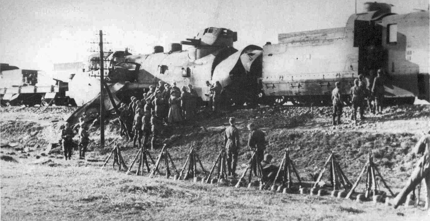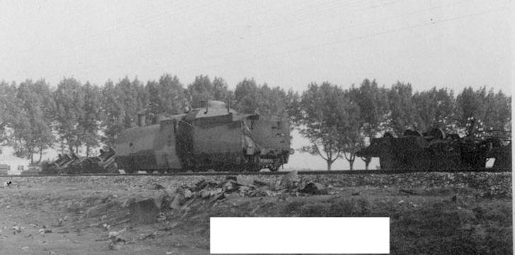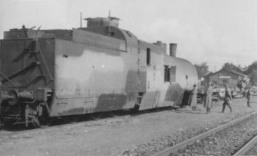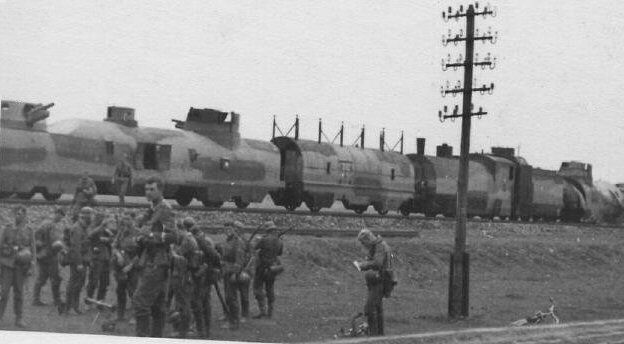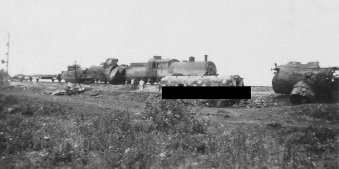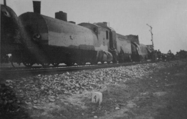 | Longer perspective view – on the left there is possibly an auxiliary part of the armoured train (in spite of two locomotives in front of it). |