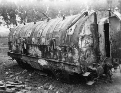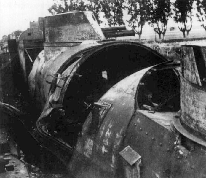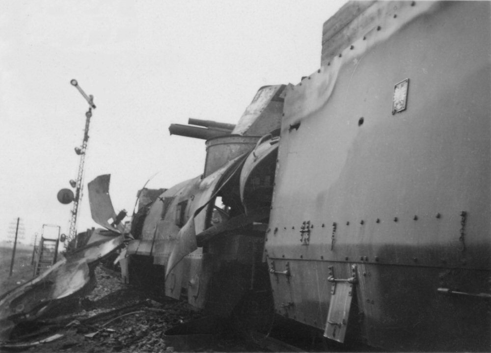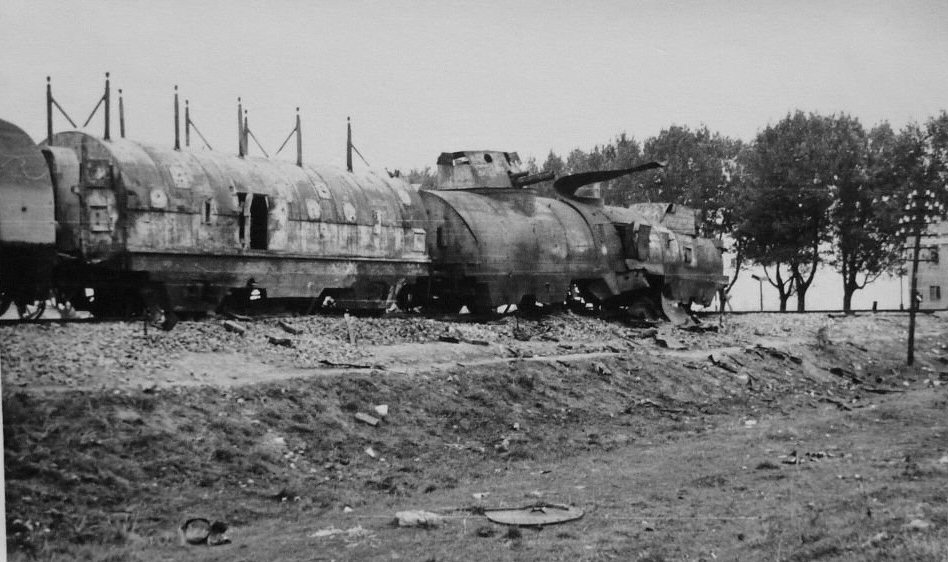 Rear artillery wagon. Internal explosion destroyed whole middle part – a two-layer armour structure of Polish-built wagons is visible. Between split layers of armour there is drum machine gun mounting. Fire marks are also visible. |