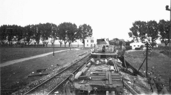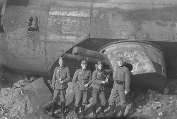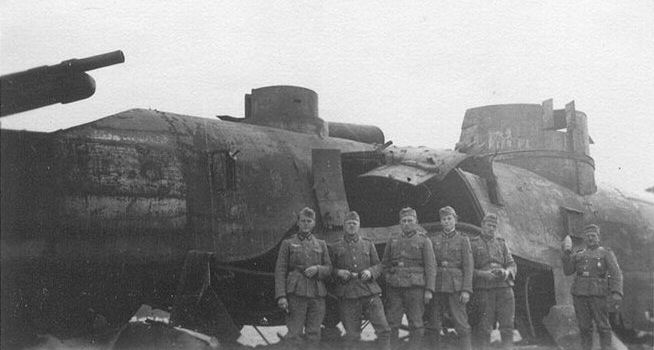 On the left, interesting early photograph, clearly showing relatively intact leading artillery wagon and assault wagon, mentioned before. There are no fire marks on them either. Note, that the assault wagon still has all antenna masts, and 75 mm cannon barrel in higher turret is in normal position. Since it is early photograph, it is enigmatic, why closer track is not jammed. As far as it is known, this photograph was first interpreted in 2019 on our page. |