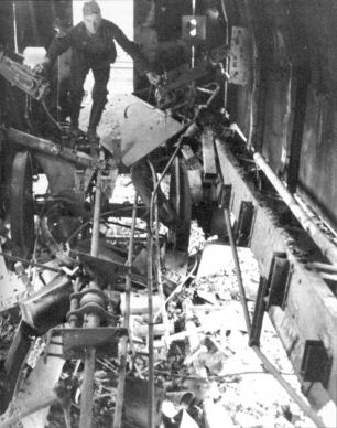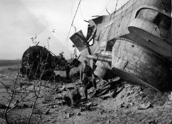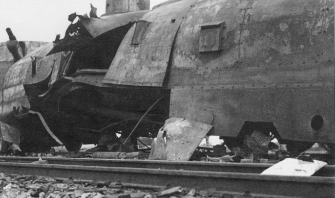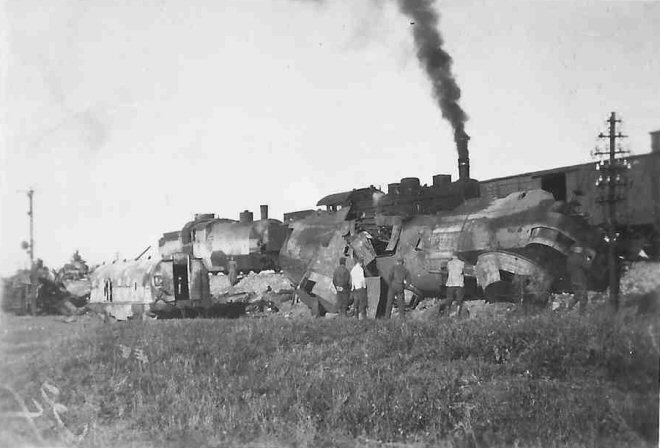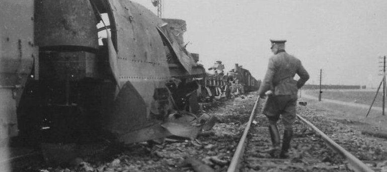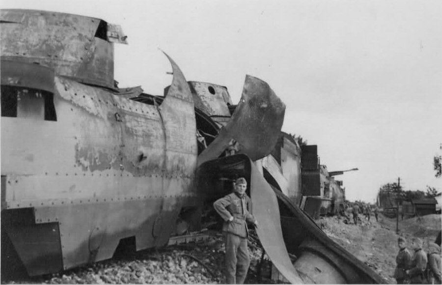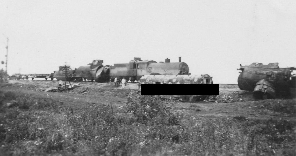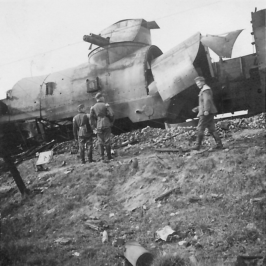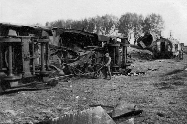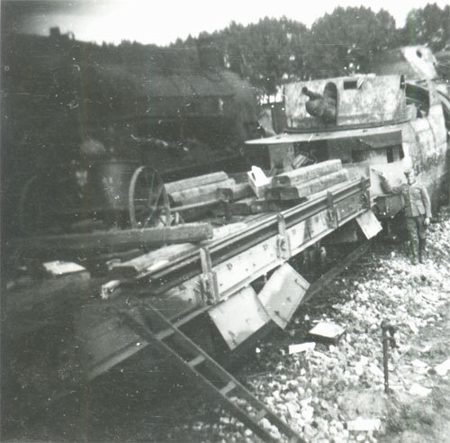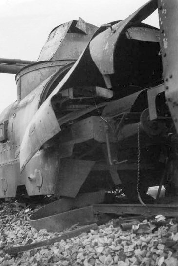 Irreparable wagons were later thrown off of the track. Partly obscured, but interesting photograph with rear artillery car still on the track. |