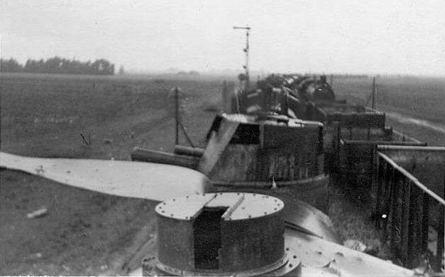A view towards the train's front – gently rounded end wall of artillery wagon is visible, with drum machine gun mounting in it. There are additional tool boxes under a chassis of rear flatcar. Well visible are details of clothesline antenna above the assault wagon – outward mast on closer side has been apparently broken and hangs on antenna wire. |