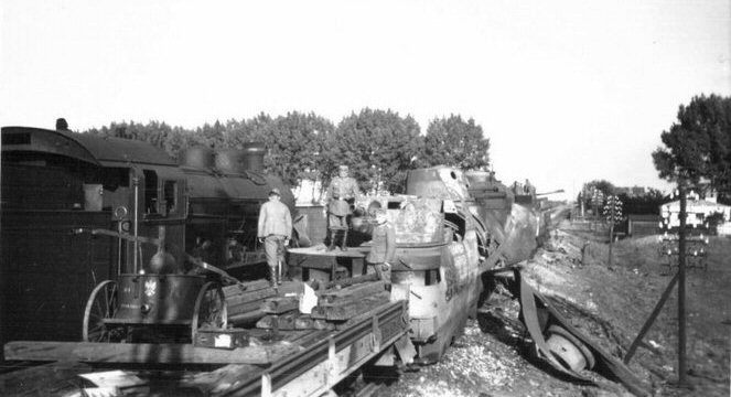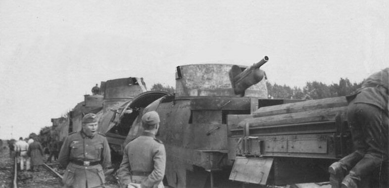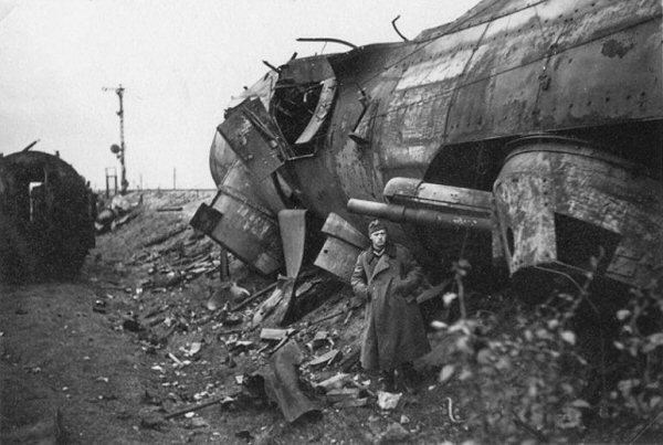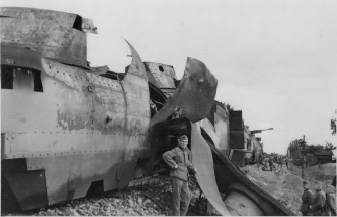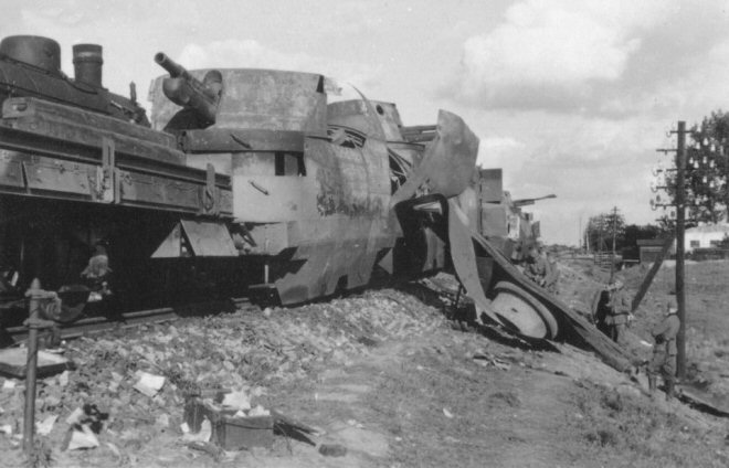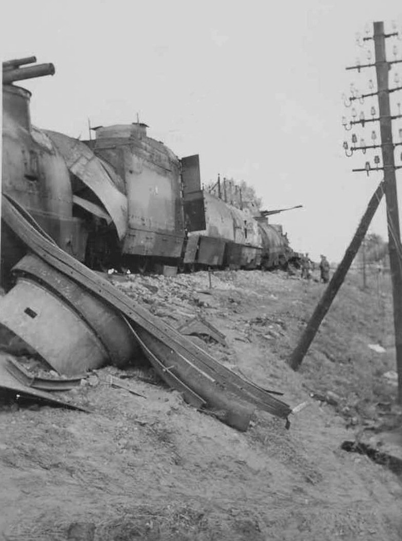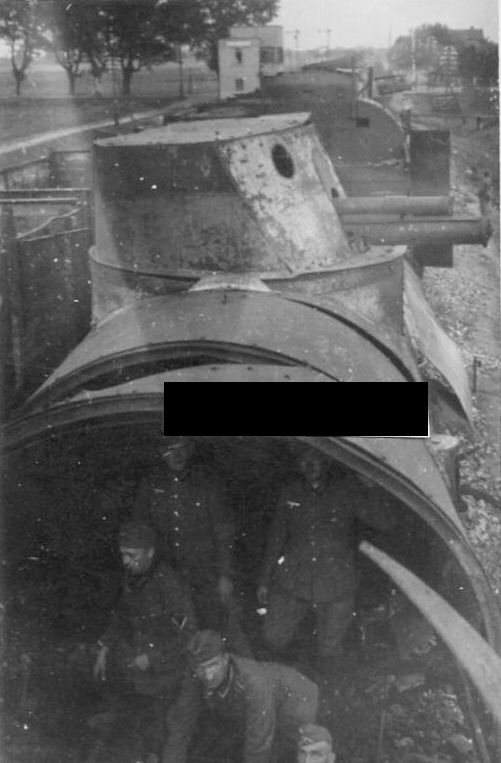 The page contains a walkaround gallery of Polish World War II armoured train Nr.12 (former "Poznańczyk"), abandoned and destroyed by the crew on 9 September 1939 in Płochocin village[Wikipedia], due to cutting off its withdrawal route to Warsaw by German troops in Ołtarzew. The armoured train, much more powerful, than its German half-improvised counterparts of that time, and blown-up in spectacular way, became a subject of numerous photographs taken by German soldiers. Judging from a number of photos, that keep being revealed in the Internet from private collections, it surely was one of most often photographed armoured trains ever – there might be risked a thesis, that it was the second most photographed one, after another Polish armoured train Nr. 13 ("Generał Sosnkowski"), bombed next day at Łochów station.