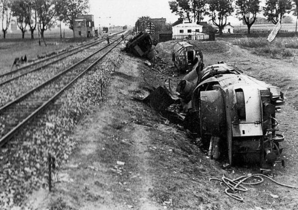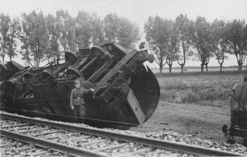 The second artillery wagon, lying on a side. The photograph shows the place well, in the train's move direction, before the crossroad and Płochocin train station. On the left, the signal box. Nowadays there is a football ground to the right (satellite map) |