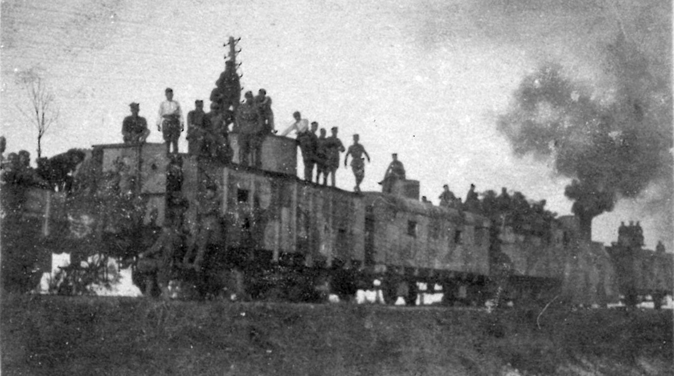 Officers of armoured train "Śmierć" in 1920 gathered around its commander Lt. Henryk Amrogowicz (probably by the commander's wagon in auxiliary section). |