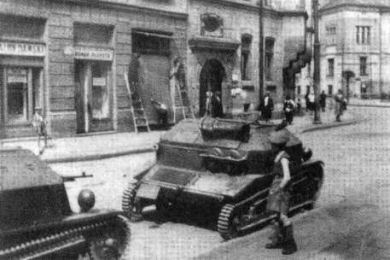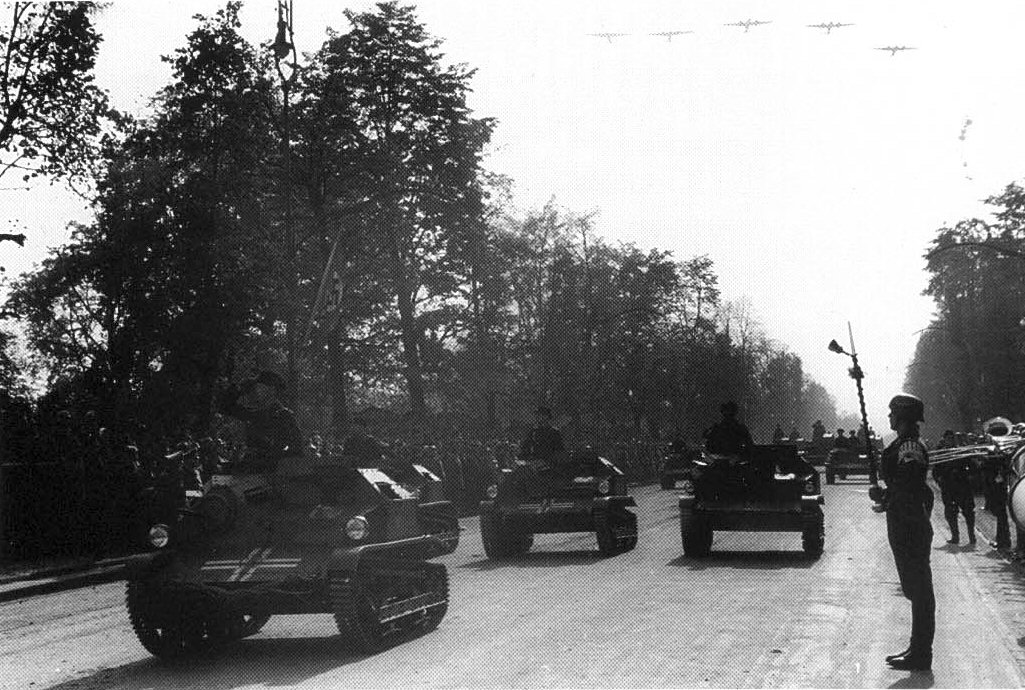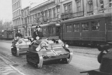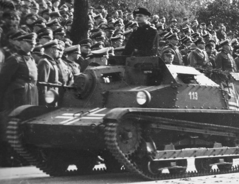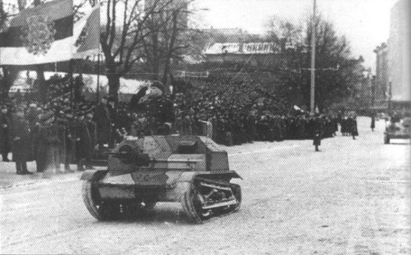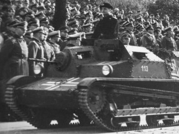 German TKS of the Light Panzer Company East on a victory anniversary parade in Warsaw on 6 October 1940. The German machine guns are visible. Note tank numbers and a size of recognition crosses. See also another photograph. | |