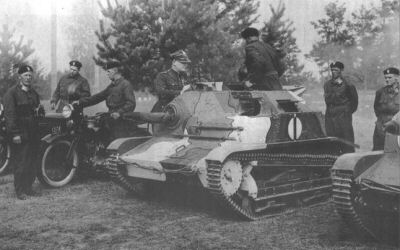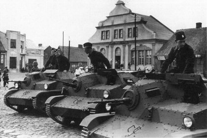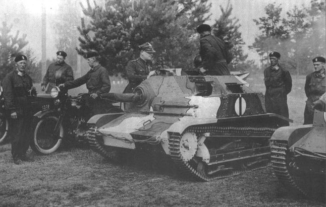 The Polish TKS platoon in Estonia (Polish truck Polski Fiat PF-621L is on the right). In a background, Estonian Crossley M1927/28 armoured cars (superficially similar to Polish wz.29 Ursus cars). |