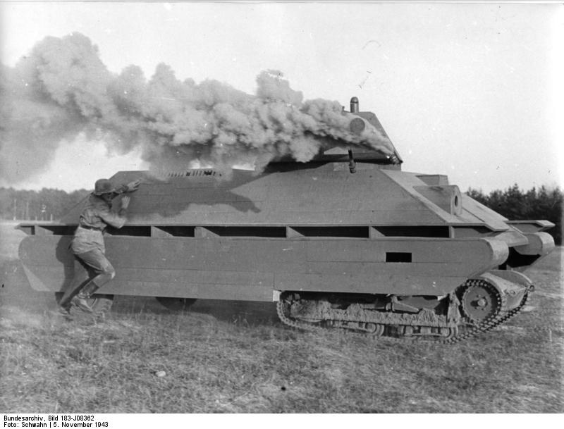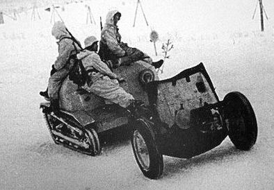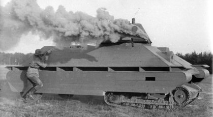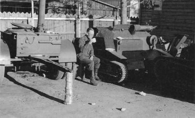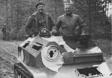 An interesting conversion of the TK-3 to a light tractor role, with a simple windshield replacing an armoured superstructure. | An unusual employment of the TKS, as a basis of a training mock-up of a T-34 tank, 5 November 1943 (Deutsches Bundesarchiv, released under cc-by-sa 3.0 licence, source: Bild 183-J08362). |