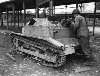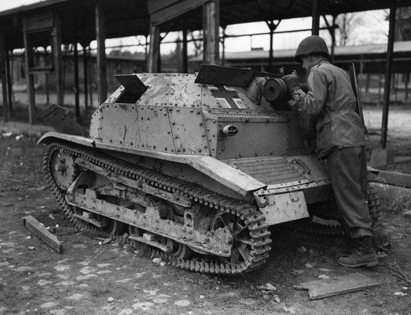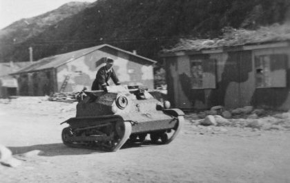 A nice view of a fast moving TKS - a landscape suggests Norway. A soldier is standing on a rear armour apparently. | The German TKS examined by the US soldier near Bitsch in France, 17 March 1945. The tankette is apparently repainted dark yellow overall. |