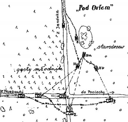 In his accounts W. Tritt described, that it was not an ambush, but a meeting engagement from a distance of several dozen meters, in which Polish tankettes were sent into the forest and got under a fire. He took up a firing position behind a large anthill, partly covering the tankette, then hit and set two tanks on fire. Before that, the second tankette had overtaken him, and the third had driven into a pit and could not take up a position so quickly. This version does not exclude however, that the second tankette could have fired at the same targets. Tritt could not have fired at the third tank immediately because of a need to change position and turn right. He further stated, that the uhlans pulled up an anti-tank gun and placed it next to the tankettes, but when it was taking up a position, the third tank began to withdraw towards the Poles, and overturned the cannon with its rear when making a turn. Then, it was "fired jointly by all of us until it caught fire". Unfortunately, Tritt did not mention any other names, except Pachocki, who was the only casualty, slightly wounded by a splinter (it should be noted, that Roman Nawrocki claimed, that he got the cannon-armed tankette after Pachocki had been wounded around 10 September – maybe he was hurt twice, or it was a mistake in one of the accounts. It is worth expressing regret by the way, that in most of the accounts, their participants do not mention the names of their crew members and all colleagues who took part in the battles...). According to all Tritt's accounts, German captives shouted, that "their general" remained in a burning tank, and a general's coat was found inside, what he associated later with an information on a death of General Werner von Fritsch. This is unbelievable as far as the general's death is concerned, however it is worth noting that the description itself is identical to Orlik's account according to Okuszko, about Germans telling, that "their captain" remained in the tank.
