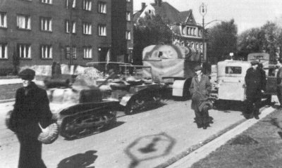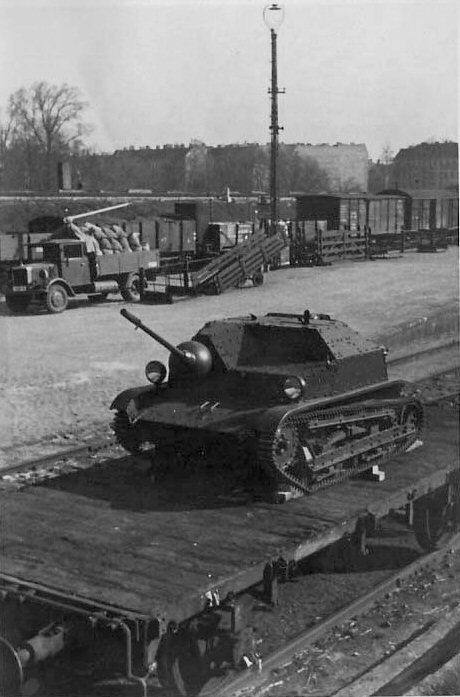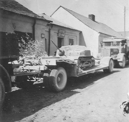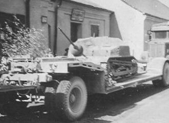 Left: a cannon-armed TKS transported by the Germans after its capture on Sd.Ah. 115 trailer. Right: a cannon-armed TKS, hauled by C4P halftrack tractor after a surrender of Warsaw (along with C2P tractor) - the same, as the first one under section "Combat use". |