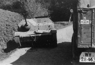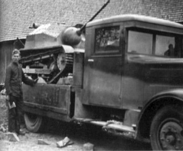 Abandoned TKS with a cannon upon Polski Fiat 621L truck (ordinary truck, not a special tank transporter). Evident is the truck's camouflage. [Courtesy of Ireneusz Zapaśnik from his collection] |