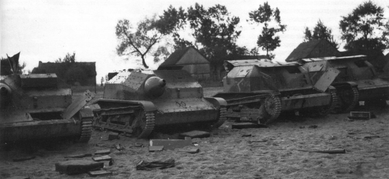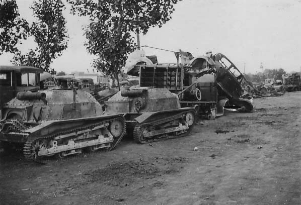 ↑↓ TKS tankettes gathered after a battle of Tomaszów Lubelski, probably on Bełżec station. The first on the right is cannon-armed. |